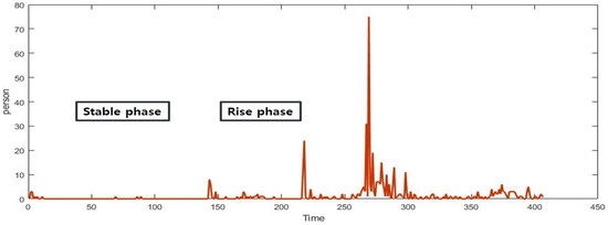 Figure 14 is a graph of the number of people infected with COVID-19 in a CP over the past year in Korea. Overall, these results imply that the 1st, 2nd, and 3rd waves in Korea affected the number of infected inside of the CP. In addition, it can be seen that the disease spreads by repeating it into both a stable and a rise phase. Further, we can confirm that the number of infected is increasing in the real world.