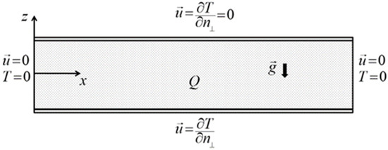 A two-dimensional horizontal rectangular porous enclosure with large aspect ratio (width (L)/height (h)) was considered saturated with the investigated bio-nanofluid, as illustrated in Figure 2. These boundary conditions were selected for the sake of directly using the solutions of Benos et al. [33], who investigated this flow configuration by also considering a volumetric internal heat source, Q, and a constant magnetic field, B0. To simplify our study, we incorporated this work by neglecting the Lorentz force term and using the Oberbeck–Boussinesq approximation, while the subscripts of nanofluid were converted to bio-nanofluid (bio). The equations characterizing the present flow were continuity and momentum in both directions, and energy conservation: