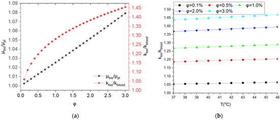 (a) Relative dynamic viscosity and thermal conductivity as a function of the nanoparticle volume fraction (%) for T = 42 °C and (b) Effect of temperature on relative thermal conductivity for a range of φ.