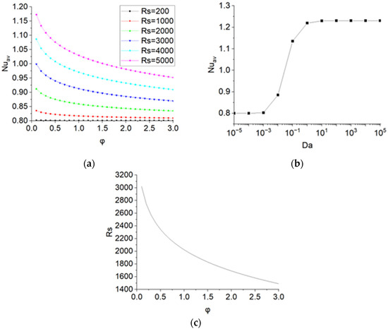 In contrast with the above trend, a decrease in the Darcy number was anticipated to decelerate the bio-nanofluid, which resulted in the deterioration of the cooling process. For the sake of brevity, only the average Nusselt number was given as a function of Darcy number by considering a logarithmic scale in the horizontal axis (Figure 5b) for the purpose of displaying in a compact way the wide range of Da values. As a consequence, the scaled Rayleigh number could be increased through enhancing the volumetric internal heating, Q, and nanoparticle volume fraction, φ, whereas Da was independent of the nanoparticle concentration. Finally, the core region solutions were not affected by the Prandtl number for these relatively small values of Rayleigh numbers. These values (200 ≤ Rs ≤ 5000) assured that a laminar regime existed, which also constituted the regime where these solutions were valid, as was ascertained in [22].