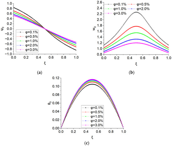 As far as the problem of the heat transfer and flow of the bio-nanofluid within the porous enclosure was concerned, the dimensionless numbers Da and Rsnf seemed to determine the whole process. The main characteristic of the present hydrodynamic flow was that a symmetric double-cell Hadley circulation was observed with the fluid ascending in the hot core region of the cavity and descending in the vicinity of the vertical cold walls. As was also stressed in [16,22,34], the heat transfer was enhanced as the Rayleigh number increased. This can be observed when noticing the increase of the streamfunction, ψ0, and vertical velocity, w0, in the core region (Figure 4a,b, respectively). This increase, in turn, resulted in smaller temperature values, θ0, in the core region (Figure 4c) and also larger values of average Nusselt numbers, Nuav (Figure 5a). In this fashion, it should be pointed out that the scaled Rayleigh number could be increased as a result of the increase in the volumetric internal heating, Q. Consequently, when heating a tumor in the framework of hyperthermia, it is expected to accelerate the flow in favor of the heat transfer. On the other hand, the scaled Rayleigh number was also a function of nanoparticle volume fraction, as can be noticed in Figure 5c. More specifically, it was observed that the Rayleigh number could be decreased up to 50.7%, when the volume fraction changed from 0.1% to 3% for this example. Hence, an increase in the number of nanoparticles channeled into the tumor tended to decrease the heat transfer. This trend can also be observed in Figure 6a–c, where, similar to the above description, as φ increased, the Rayleigh number decreased (Figure 5c) and, thus, the heat transfer deteriorated. This was obvious from the lower values of streamfunction (Figure 6a) and vertical velocities (Figure 6b), which led to larger values of temperature in the core region (Figure 6c) and, therefore, lower Nusselt numbers (Figure 5a).