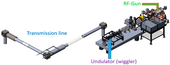 The world of science and technology is showing great interest in terahertz (THz) radiation recently. The THz (0.3–3.75 THz) research and applications have become widely popular and accessible [1,2]. There is a growing interest in developing high-intensity radiation sources at the Schlesinger Family Center for Compact Accelerators, Radiation Sources & Applications (THz Free Electron Laser THz-FEL), Ariel University [3]. The heart of the Center is a hybrid S-band (2856 MHz) photo injector, was designed by the Particle Beam Physics Laboratory (PBPL) group at UCLA [4,5,6]. A small-scale prototype of such a hybrid structure was previously designed and tested [7]. A photo-injector rf-LINAC gun produces short electron pulses which drive the FEL. The rf-LINAC has a hybrid structure with both standing and traveling wave sections. Such a structure produces ultrawide, femtosecond electron beams with a controlled energy chirp. The THz-radiation emission is being carried out from a (12 × 6 mm) flat aperture. The general layout of the THz FEL is shown in Figure 1. The THz radiation has a frequency spread of 10% around the resonance frequency. A spectrum tunable in the range of 1–3.5 THz. A short-pulse THz-FEL with a power of 150 kW using a 90 cm Undulator, will be driven by this photoinjector beam. Radiation emitted coherently from all the electrons within the pulse, causes an effect of enhanced emission [8,9,10,11]. A super-radiation at 1–3 THz [3,12] is achieved as a result. (if the emitting electron bunch is less than 0.1 mm pulse length, the emitting electron bunch must be shorter than the wavelength for the coherent emission in the super-radiant regime).