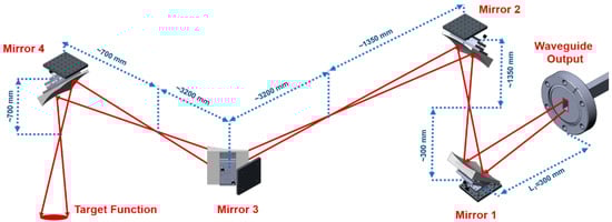 The results from the previous section will be entered into an optical system simulating the TL was designed in Zemax (as mentioned above). The TL is used to transfer the beams from the accelerator to the experimental laboratory in the THz beams. It should only be noted that the TL consists of 4 parabolic off-axis mirrors. And the system itself is built according to the principle of “Gaussian beam telescope” [35]. Therefore, in a paraxial approximation there is no dependence on the wavelength.