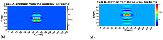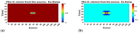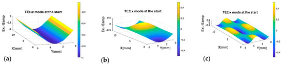 The Ex field at the waveguide output: (a) TE01 mode; (b) TE21, and (c) TE23 modes. Note: In this case for a convenience, the EM field is in the −180° time phase at the output of the waveguide at zero moment. Therefore, is each mode respectively. For convenience, each mode is displayed in a normalized form. When Eamp is calculated by following form: Eamp = ExMAX − ExMIN.