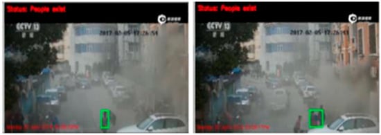 Figure 1 shows two examples of detecting a person obscured by smoke using the KNN classifier and the system classifier [34]. An adaptive background subtraction algorithm was used to identify moving objects based on the dynamic characteristics of smoke. Two features, colour and fuzziness, are applied to filter regions without smoke motion. Only an area that satisfies certain colour analysis and fuzzy characteristics is selected as an acting candidate area. There are still problems determining the existence of humans for various reasons, including the smoke itself. However, it is possible to determine a person’s presence by detecting only a part of the body as a feature point, if the person is partially covered by smoke.