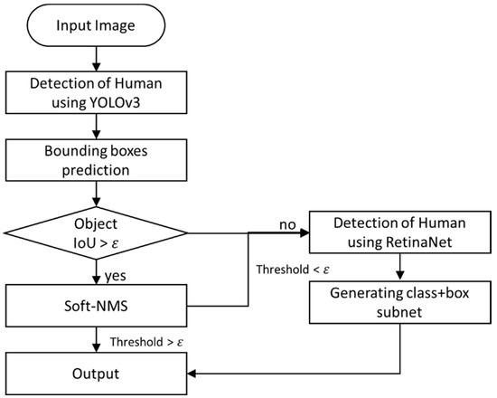 The method uses CCTV installed in buildings and has a faster detection speed and higher accuracy than the techniques presented in previous studies. To this end, we used You Only Look Once (YOLO) [31] and RetinaNet [32], which are both 1-stage methods (rather than 2-stage such as the convolutional neural network (CNN) or Fast-RNN [13]), and by merging them, we designed a method to detect disaster victims faster and more accurately.