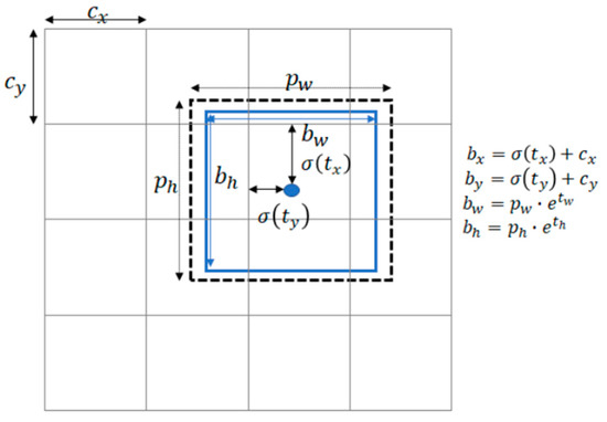 The creation of bounding boxes in the first step is shown in Figure 5. ph and pw represent the height and width of the anchor box; tx, ty, tw, and th represent prediction values; and bx, by, bw, and bh represent post-processing information. b is the predicted offset of the bounding box to be used in the anchor box. c indicates the offset of the upper left end of each grid cell. The object is detected using the final value of b and the ground truth IoU, calculated by the following equation: