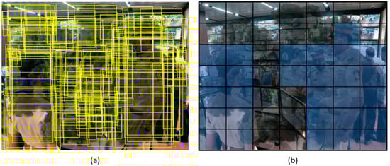 Figure 7 shows how to set the object candidate group during the work to detect disaster victims covered by smoke using YOLOv3. Figure 7a shows the generation of bounding boxes surrounding predicted objects. Figure 7b shows the areas where it is predicted that there are humans. Following this step, and further preventing the correct bounding box from being deleted due to the phenomenon of occlusion of a human by smoke (Equation (2)), only the most reliable bounding box is left, and the final result is shown in Figure 8 below.