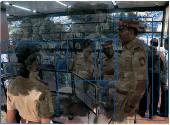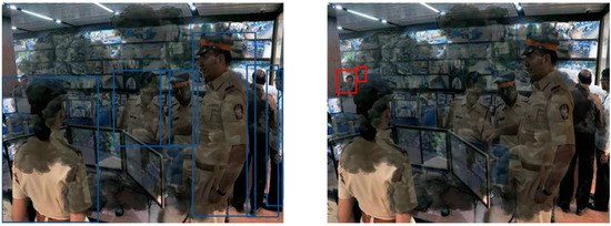In addition, our goal was to detect people obscured by smoke in an indoor disaster situation, in particular, a fire, rather than detecting a person in a generic situation. Thus, the occlusion phenomenon occurs for humans as objects being detected. In this case, a problem arises when the correct box may be deleted. Using the following formula prevents the box from being deleted: