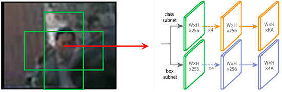 Although it is predicted that there is an object in the ground truth box, it results in an FN classification that cannot extract the object, as shown in Figure 9. Although there are no objects in these FN or ground truth boxes, secondary detection is performed using RetinaNet only for objects classified as FP, which predict that there are objects (Figure 10). RetinaNet puts an anchor box on each point per feature map.