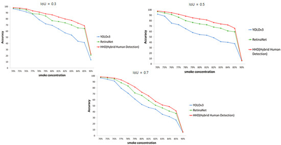 Figure 12 below shows the relative accuracies of the YOLO, RetinaNet, and HHD methods when applying IoU values of 0.3, 0.5, and 0.7. For a smoke concentration of 70%, the accuracy of the three methods was similar, but for 75% and higher, the HHD method was more accurate.