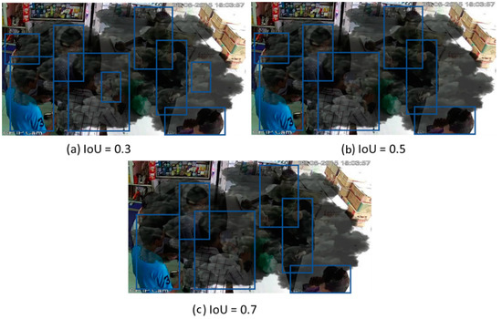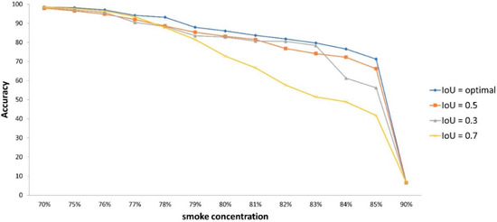 A value of IoU = 0.3 gave the highest overall detection accuracy, however, as shown in Figure 13, a person was detected in a part of the image where there was no person. Therefore, IoU = 0.3 is not ideal for this task. IoU = 0.7 gave more accurate results than IoU = 0.5 for 70–79% smoke concentration. However, the accuracy is lower for a smoke concentration of 80% and higher. As the smoke thickened and obscured more people, the accuracy decreased.