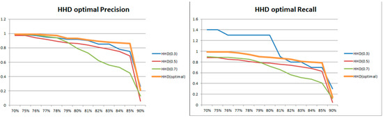 Precision and recall graph, by smoke concentration, with IoU = 0.3, 0.5, 0.7, and IoU optimal values, for the HHD method.