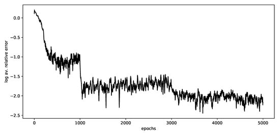 In Figure 2 we illustrate Log-average relative error of relative to the reference value 6.2825, based on 10 independent realizations. We observe that the relative -error decreases with increasing epochs.