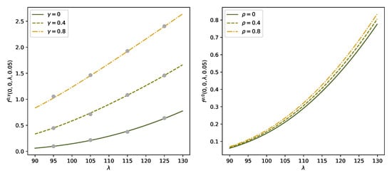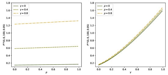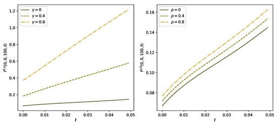 In this case study, we are particularly interested in the impact of the correlation parameter and of the pricing contagion parameter on the CVA. We therefore construct a neural network with additional input variables and . During the training procedure we use different values of to simulate the paths of and different values of to compute the integral term in (24). In the sequel we write to stress the dependence of f on and . Figure 3 shows for varying default-intensity ℓ and Figure 4 for varying in the left panel and varying in the right panel. Moreover, all figures compare the solution for different values of and . We see that increases in both and , but the effect of price contagion (i.e., variation in ) is quite pronounced and dominates the effect of dependence between intensities (i.e., variation in ).