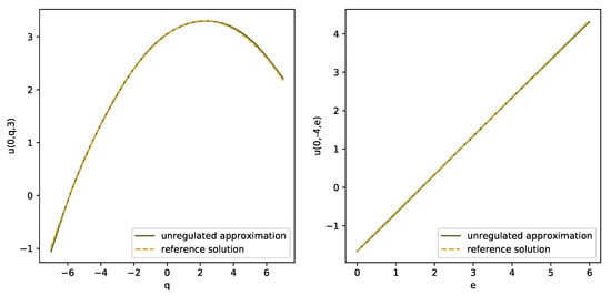 We used the midpoint rule (34) to linearize the PIDE. The network architecture was as in Remark 6. The training for the whole network consisting of 20 subnetworks (a DNN for every grid point , and a DNN for every midpoint ) took around 4400 s. Table 3 contains the parameters used in the experiment. Figure 6 shows the approximate solution obtained by the deep splitting algorithm (solid ine) and the analytic reference solution (dashed ine) for varying in the left panel and varying in the right panel.