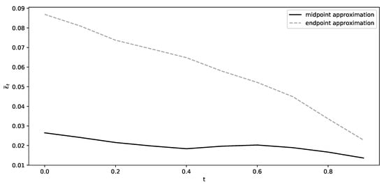 As the solution u can be zero, we report the absolute -error between the DNN approximation and the analytic solution, that is, To compute the absolute error, we used 10,000 simulations of where and . Figure 7 illustrates the mean of 10 different DNN approximations for each time point , using once the midpoint rule (solid ine) and once the original method from [14] (dashed ine). We see that the algorithm based on the midpoint rule performs substantially better than the original deep splitting method.