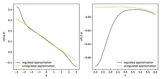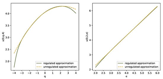 Due to the boundary condition, the Ansatz does not hold and we have to compute via the deep splitting algorithm. In view of its superior performance in the unconstrained case, we worked with the midpoint procedure, and we used the same network architecture as in the unconstrained case. We worked on the set . Figure 8 illustrates the DNN-approximation for (solid ine) and (dashed ine) on the sections (left panel) and (right panel). The right plot shows that with risk capital constraints the value function is concave in e and for significantly lower than (for the point belongs to the lower bound of D).