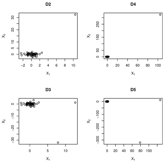 - /—the design matrix with the most and second most extreme points by Euclidean distance moved 10 and 100 units, respectively, in the X direction. The two extreme points have a masking effect on collinearity (see scenarios and in Figure 1).—a correlated design matrix case with high leverage points [14,30]. In , we partitioned the design matrix, , where the uncontaminated part, and the contaminated sub-matrix ( is the mean vector of ones and is an identity matrix). The exponential decay , for , generates the th entry of covariance matrix and is the mean vector of zeros. The design matrix has contamination points (using contamination rate of ) from observations.