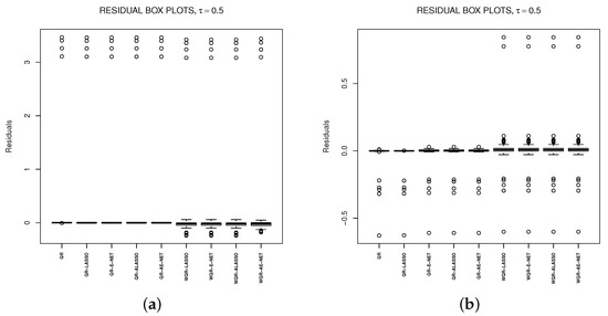 Although the use of may be applicable to the estimator ( at ) for the symmetrical distribution, it may not be applicable at extreme quantile levels in the presence of high leverage (and collinearity influential) points. This is due to the fact that the presence of these atypical observations result in planes often crossing (unequal slope parameter estimates) (see [21,22]), although they are theoretically parallel. Therefore, instead of using , we suggest using the one based on , , which is the solution to the minimization problem