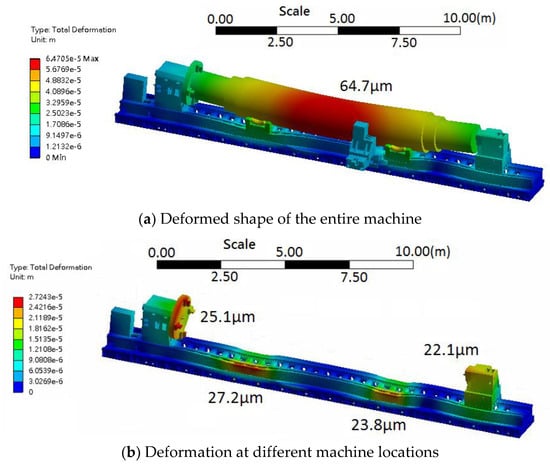 Figure 7 shows the total deformation of the entire machine under its self-weight and the rated load of the workpiece (60 tons). The maximum deflection of the workpiece was 64.7 μm near the middle section owing to bending under gravitational load. The total deformation of the machine bed at the roller supports was approximately 23.8–27.2 μm and the deflection at the spindle chuck and apex of the tailstock were approximately 25 and 22 μm, respectively. Notably, the spindle chuck mounted on the headstock exhibited significant deflection owing to the clamping load from the workpiece.
