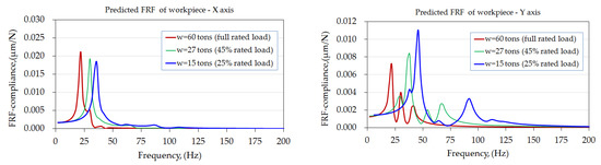 Figure 13 illustrates the FRFs predicted at the cutting point on the workpiece in three orthogonal directions. These FRFs represent the variation in dynamic compliance with the change in the excitation frequency of the cutting force and show that the frequency responses of the workpiece vary with its weight. The maximum compliance occurs at a different frequency for each orthogonal direction; these frequencies are associated with the vibration modes for rolling motion in the X-direction, vertical motion in the Y-direction, and pitching modes in the Z-direction.