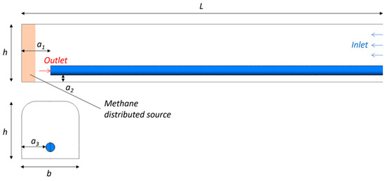 In this paper, we analyze the dynamics of methane–air mixtures in a dead-end drift using a 3D numerical simulation of steady flow. The methodology of 3D numerical simulations of gas–air mixtures has been extensively researched, with many papers having published the results of 3D calculations of multicomponent gas flows considering both forced and mixed ventilation systems in dead-end excavations [4,21,22,23]. An exception is the study [24], where a dust-air mixture is numerically simulated using exhaust ventilation. Dust is modeled as a continuous phase. Many studies also consider the application of CFD methods to analyze the DPM dynamics in blind excavations [20,25], the explosions of accumulated methane [26,27], and the dynamics of non-explosive gas components in excavations [28]. This methodology can be applied to the case of the exhaust ventilation systems that we consider in this study. At the same time, we introduce several new features to define two boundary zones where methane is released and where air leaves the computational area. This will be discussed further.