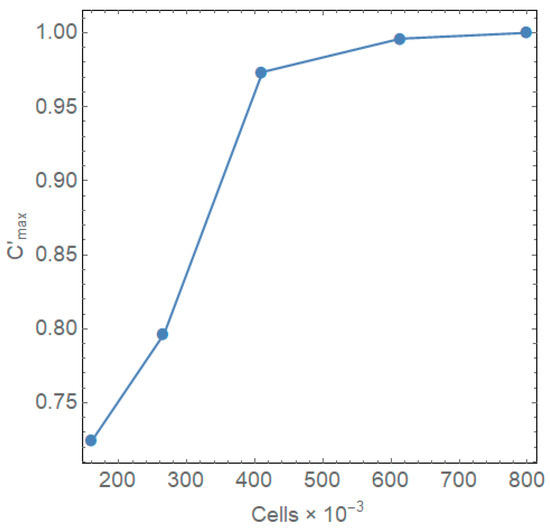 To numerically solve the system of equations, we used the SIMPLE algorithm with first-order accuracy with respect to all the required variables [36]. The calculations were performed in the ANSYS Fluent 2021 R2 software. The problem’s stationary solution was searched iteratively, and the criterion for stopping the iterative procedure was that the relative residuals of all required parameters were less than 10−5. Additionally, the solution’s independence from the mesh was analyzed. Figure 2 shows the dependence of the dimensionless maximum methane concentration on the symmetry plane on the number of mesh cells. Here, is the dimensional maximum concentration for the current mesh and is the dimensional maximum concentration for the best mesh (804,563 cells). In this analysis, the case involving the maximum methane release intensity of 0.024 m3/s and air velocity of 0.2 m/s in the dead-end drift is considered.
