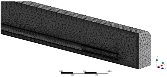 For the calculations, a mesh with 401,907 cells was adopted (see Figure 3). In the inner part, tetrahedral cells were used, with an external boundary layer of prismatic cells. Near the end of the ventilation duct, a higher mesh density is used to correctly reflect the high velocity and pressure gradients of the airflow. Due to the presence of spatial symmetry, only half of the dead-end drift is considered. However, this leads to the fact that a restriction is imposed on the geometric parameter a3. It should be equal to half of the drift width minus the radius of the duct.