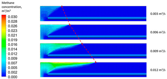 Figure 4 shows the calculated distributions of the gas concentration in the middle vertical section of the dead-end drift at various methane emission rates with a constant air velocity of 0.2 m/s at the entrance to the computational domain. The maximum gas concentrations in all cases are observed near the roof of the drift; this area is associated with a lower methane density, and the airflow is directed along the bottom of the drift, where the end of the ventilation duct is located. Figure 4 also illustrates the velocity vector field within the considered vertical section of the domain. The analyses of the velocities and concentrations show that several convective vortices are formed in the upper part of the drift, where air–methane mixture circulation occurs. One vortex is located between the dead end and the ventilation duct end, while another vortex extends along the top of the drift (only for Q ≥ 0.009 m3/s). The latter vortex can be quite long and depends primarily on the methane release rate. The vortices interact and exchange mass with the main airflow moving along the dead-end drift from right to left and entering the ventilation duct.