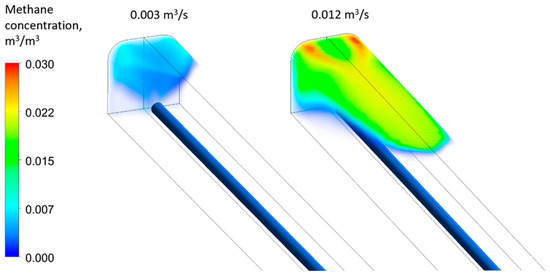The maximum concentrations of methane in Figure 4 and Figure 5 were found to be very high (0.03 m3/m3). These methane concentrations are very close to the lower explosive limit for methane–air mixtures [37] and should thus not be allowed in mine excavations, even if the high-concentration region of the methane cloud is localized in a small area near the roof of the excavation. However, it is important to note that the methane emission rates used here (0.003–0.024 m3/s) are overestimated compared to a realistic emission rate range (0.0003–0.003 m3/s) to better understand the general patterns of methane movement in dead-end drifts when exhaust ventilation is used.