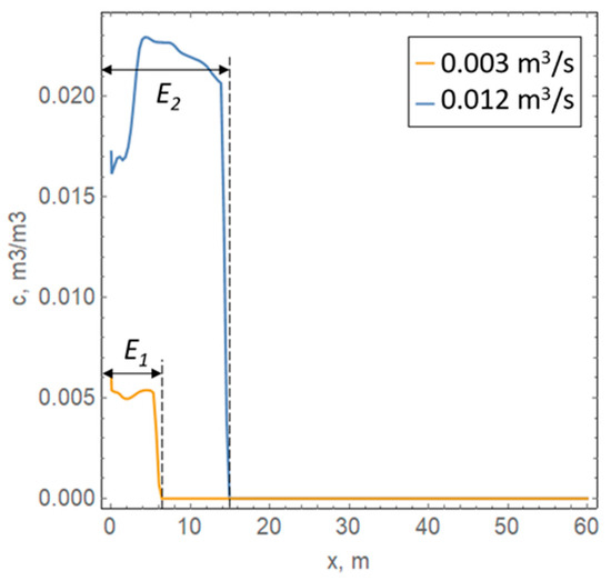 An aspect of interest is to analyze the length of the methane cloud at the drift’s roof as a function of the methane emission rate and inlet air velocity. The methane cloud length is determined here as the minimal distance E from the left boundary of the region (dead-end face) in the X-direction axis along the line Y = 3.95 m at which the methane concentration is below 10−5 m3/m3. For example, Figure 6 illustrates how E is calculated for methane emission rates of 0.003 m3/s (E1) and 0.012 m3/s (E2).