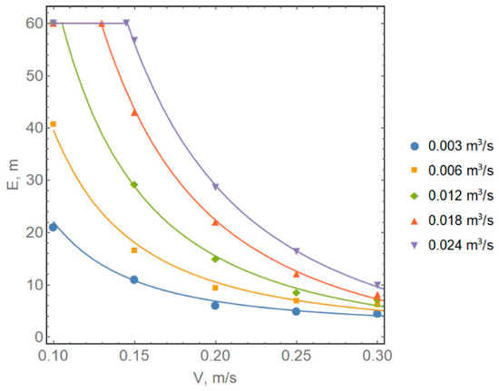 Figure 7 shows the calculated dependences of the length E on the inlet air velocity for four different methane emission rates. The colored dots represent the results of individual numerical calculations, and the continuous lines show the corresponding approximated curves using the fitted function: