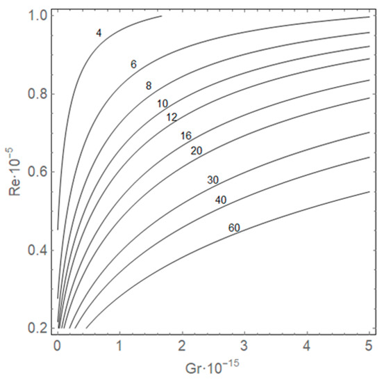 The gas Grashof number is introduced so that its value can be used to estimate the methane emission rate, which is characterized by the corresponding dimensional value . The dimensionless complexes (21) and (22) are introduced for the case when the characteristic length is equal to , and the characteristic time is equal to . The length E of the methane cloud is then conveniently represented in the phase plane of the main dimensionless parameters of the problem, Re and Gr (see Figure 8). The isolines in Figure 8 correspond to fixed values of the length E in the range from 4 to 60 m.