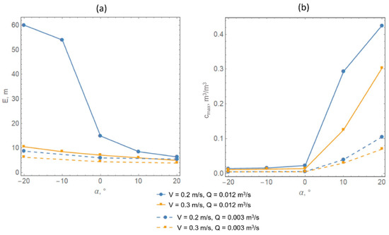 Figure 9a shows the calculated methane cloud lengths as a function of the inclination angle for two air velocities (0.2 and 0.3 m/s) and two methane emission rates (0.003 m3/s and 0.012 m3/s). We considered a realistic range of possible dead-end drift inclinations in potash mines plus a certain margin, where negative angles of inclination indicate that the dead-end face is below the drift mouth and positive angles indicate it is above the drift mouth. In general, Figure 9 shows that the resulting dependence is highly non-linear in all considered parameters. At a high methane emission rate of 0.012 m3/s, an air velocity of 0.2 m/s can no longer localize the methane cloud near the dead end. At a low methane emission rate of 0.003 m3/s, no significant changes in the methane cloud length occur at air velocities of either 0.2 m/s or 0.3 m/s. Considering the actual methane emission rates [38,39] in the potash mines of the Verkhnekamskoye potash salt deposit, the slope angle is likely to have almost no effect on the length of the methane cloud. However, in other mines, where methane emission rates may be higher, this fact may not be true.