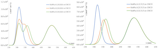 Although the calculated spectra for the SubPcs to be discussed always correspond to those in CHCl3 solution, we considered it of interest to know whether the solvent effect is important. To check this aspect, we calculated the UV–visible spectra for SubPc(A2,H,H,H) in both the gas phase and in CHCl3 solution. As shown in Figure S2 of Supplementary Materials, the solvent leads to a rather small shifting (~10 nm) of the Q band to lower frequencies, whereas the effects on the B band are almost negligible.