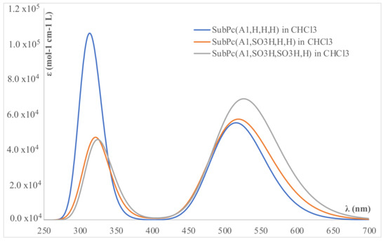 Calculated UV–visible spectra for SubPc(A1,R1,R2,R3) with R1 = R2 = R3 = H; R1 = SO2H, R2 = R3 = H; R1 = R2 = SO2H, R3 = H, dissolved in CHCl3.