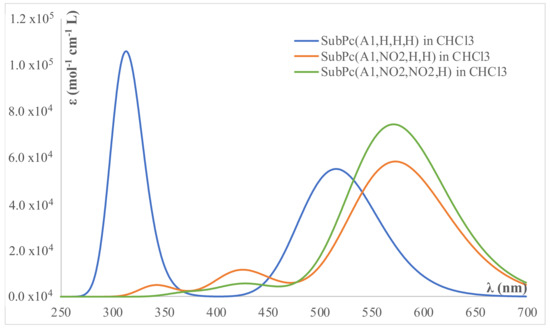 Calculated UV–visible spectra for SubPc(A1,R1,R2,R3), with R1 = R2 = R3 = H; R1 = NO2, R2 = R3 = H; R1 = R2 = NO2, R3 = H, dissolved in CHCl3.