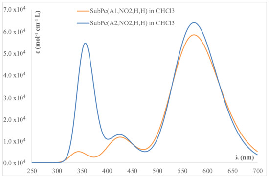 Comparison between the calculated UV-visible spectra of SubPc(A1,NO2,H,H) and SubPc(A1,NO2,H,H).