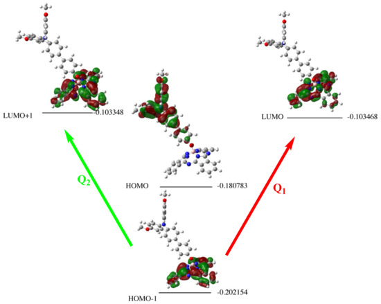 The situation becomes somewhat more complicated when moving from the parent compound to the derivative, in which all peripheral substituents are F atoms. In this case, some transitions have their origin not only in the HOMO-1 orbital but also in the HOMO-2 orbital, so the Q band has three rather than two components (see Figure 7).