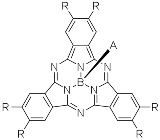 SubPcs are a typical porphyrin species (see Scheme 1) discovered in the last half of the 20th century [4]. They present a non-planar, 14 π-electron macrocyclic ring that accommodates a B(III) ion at its binding core.