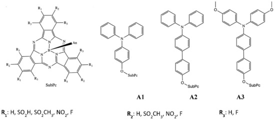 As indicated above, there are many studies on SubPcs that include a variety of peripheral substituents, but the amount of information is very scarce when dealing with axial substituents. The aim of the present study is to determine the effects on the photochemical behavior of SubPcs of three different axial substituents (An) combined with some of the most common peripheral R1, R2 and R3 substituents, as shown in Scheme 2.