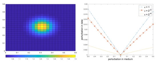 Test 2: The panel on the left shows the ground-truth medium with and in (59). The two plots on the right show, for different , the perturbation in the measured data versus the perturbation in .