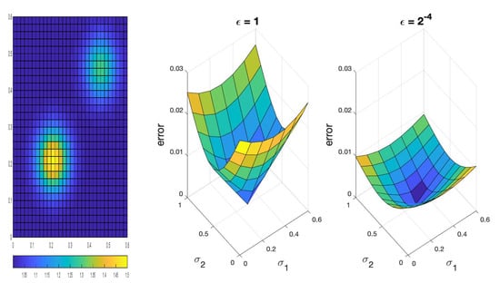 where is a two-dimensional normal distribution with mean zero and a fixed covariance matrix . The parameter is the parameter to be inferred. We assume the ground-truth , and the ground-truth medium is plotted on the left of Figure 1. The inverse problem aims at inferring this ground-truth from the prescribed data pairs. To illustrate the stability of the inverse problem, we show how, for different choices of away from the truth, the measurements differ from the true measurements. More precisely, we denote