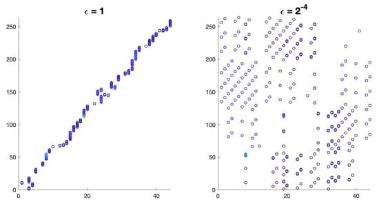 with respect to and . It is again evident that for smaller , becomes flatter, leading to a deterioration in stability, as shown in Figure 2. In addition, we identify the data that are above in Figure 3. Here, the horizontal axis is the index for the experiment, and the vertical axis is the index for the receiver. It is seen that a larger gives a sparse dataset, whereas small gives a dense dataset, meaning that all receivers receive some information about the source. This indicates that the data are more spread out for smaller , which makes the inverse problem harder to solve.