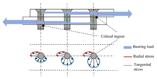 The way the loads are transmitted in single lap shear joint is presented in Figure 1, (the case of a joint with three bolts). The bolt is in contact with the hole of the plate, therefore a percentage of the load is transmitted from the bolt to the other plate (bearing load), while the remaining load bypasses the bolt (bypass load). The contact of the bolt with the plate always results in the development of stresses in the radial direction (Figure 1). Simultaneously, the bypass load results in the development of tangential stress around the hole. The tangential stresses around the hole are higher near the edges of the joint.