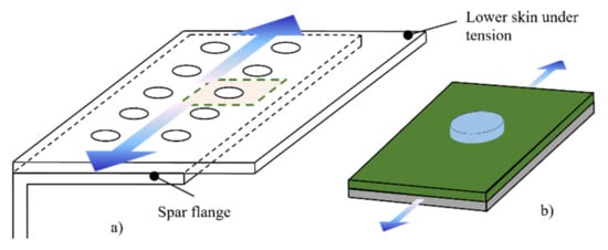 Consequently, to simplify bolted joint analysis, it is assumed that all bolts receive the same load (bearing load), and every hole in the laminated plate is bypassed by the same load (bypass load). This simplification allows the analysis of a joint with multiple bolts to be treated as a filled-hole problem. For example, the analysis of a bolted joint between two structural members (e.g., skin and spar between two consecutive ribs) includes a double row of bolts (Figure 2a), that can be analyzed as a joint with a single bolt (conceptual model) (Figure 2b). Despite the fact that the uniform loading introduces an error to the analysis, the obtained results are acceptable for the preliminary design phase.