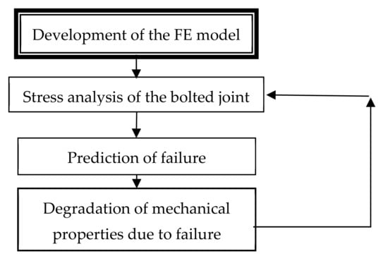 The three stages of the developed methodology (stress analysis, failure prediction, and mechanical properties degradation) are implemented in an iterative algorithm, that its repetition terminates when a predetermined final failure criterion is satisfied. The physical meaning of this criterion is the loss of the bolted joint functionality.