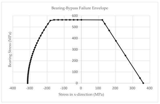 The parametric numerical model of the bolted joint is analyzed for different sets of geometric characteristics. In detail, the geometric parameters that varied are the hole diameter, thickness of the plate, and lamination. Additionally, each numerical FE model is analyzed under different loading conditions (tension and compression). Specifically, the analyses are carried out for different loading ratios (R), where R is the ratio of bearing load to bypass load. The predicted final failure determines the exact bearing and bypass loads when the bolted joint fails. By recording bearing and bypass loads at the failure of the joint, a failure envelope of the investigated joint is plotted (dotted line), Figure 5 [33].