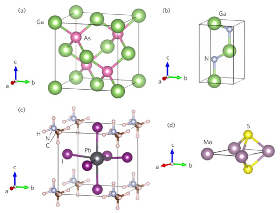 Crystal structures: (a) GaAs, (b) GaN, (c) quasi-cubic (CHNH)PbI, and (d) monolayer MoS.